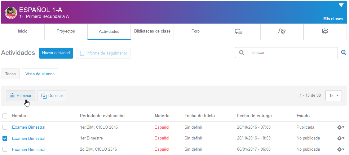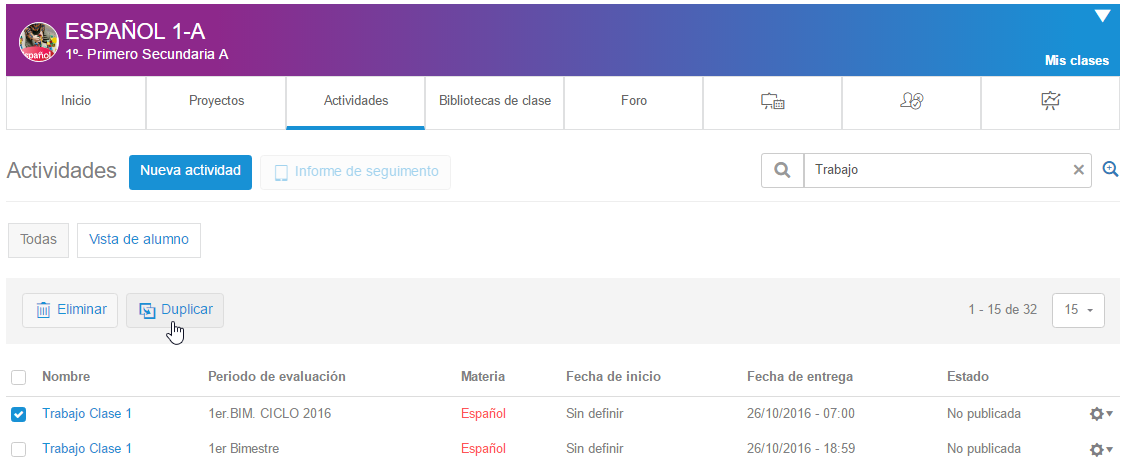 Al pulsar en duplicar, dirigirá a la sección de actividades de la clase destino.
