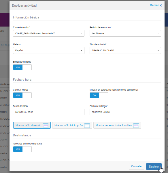 Una vez pulsado, abrirá una pantalla flotante donde se deberán de llenar los campos obligatorios y la configuración que se desee para duplicar la actividad:
