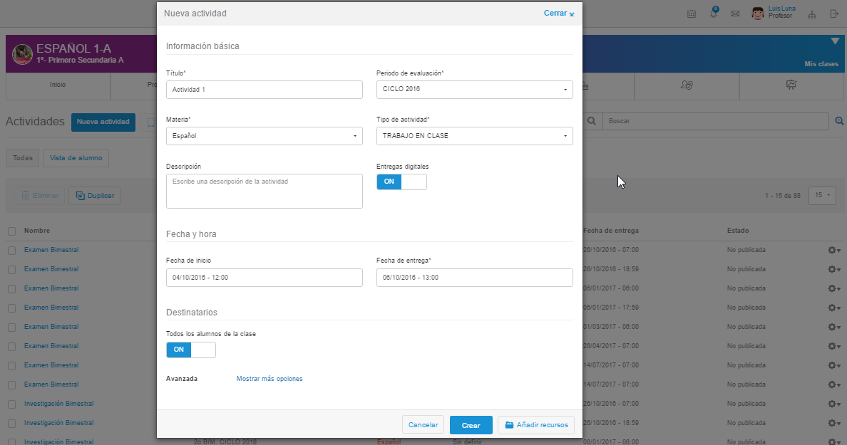 NOTA: Es importante recordar que para que un profesor pueda crear nuevas actividades, previamente el administrador deberá de asignar un modelo de evaluación a la(s) materia(s) de la clase y que el periodo de evaluación se encuentre activo (no finalizado por administrador).