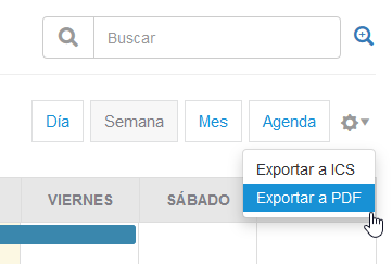 En la parte derecha a lado del botón de visibilidad de Agenda, podremos encontrar un engrane, que al dar clic nos desplazará las opciones de exportación, a ICS y formato PDF