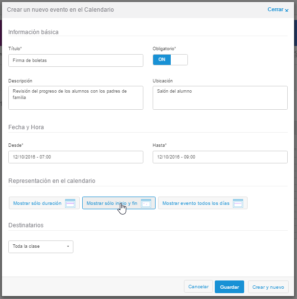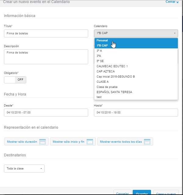 La diferencia en crear un evento desde el calendario de la clase y del general es que desde la clase es directo para los alumnos de la clase y desde el general podemos seleccionar alguna de nuestras clases en que estemos inscritos o un evento personal.