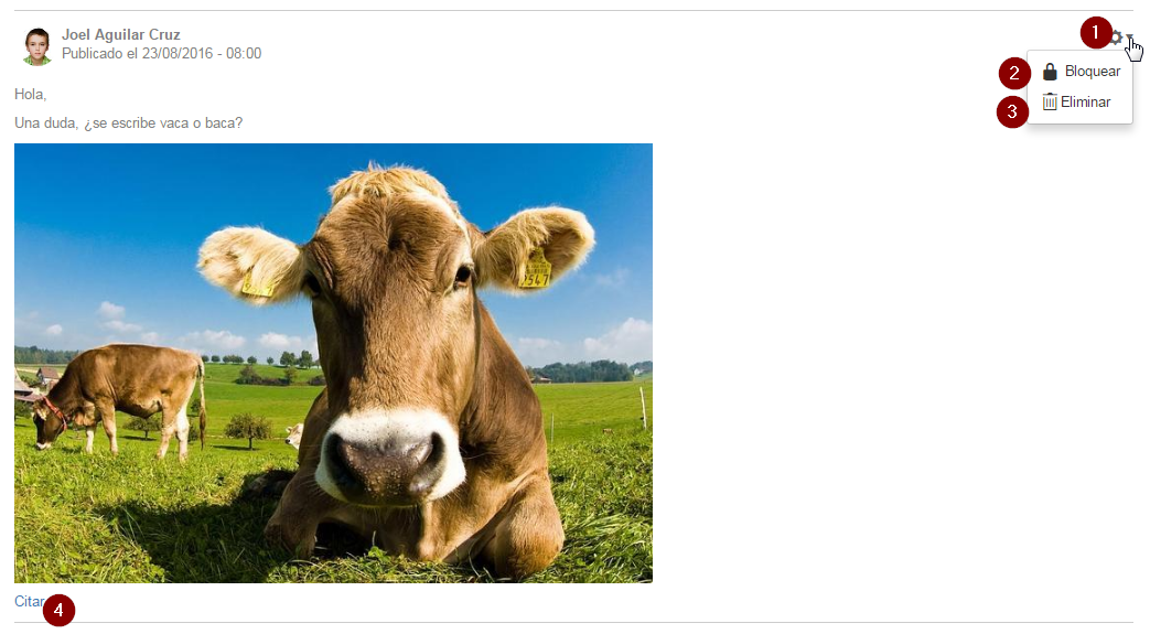 También podrá desbloquear un usuario desde una de sus respuestas en el foro. En el engranaje de la derecha del mensaje.