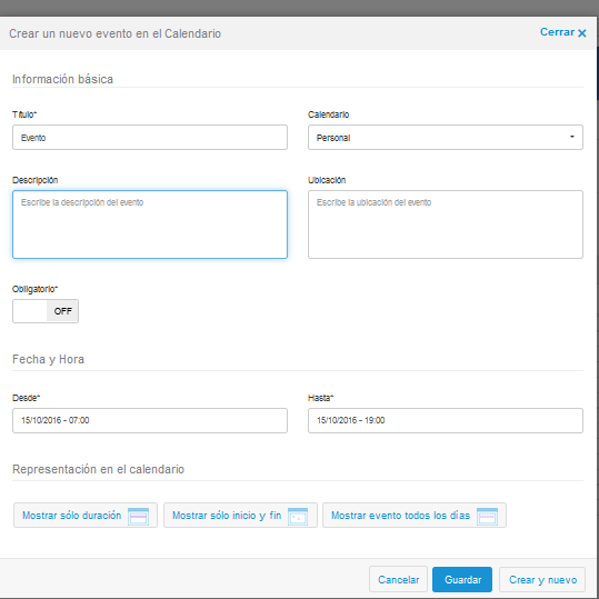 Al dar clic en el botón de Nuevo Evento, saldrá una pantalla flotante para crear eventos para nuestro calendario.