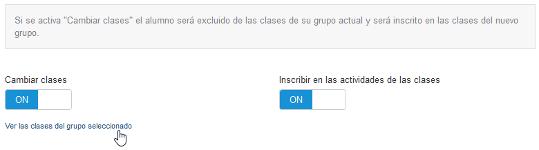 Existen dos opciones extras cuando se añade un alumno al grupo. Se puede inscribir a las clases del grupo base y a sus actividades.