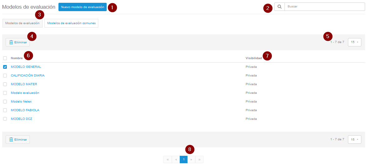 - Vista de 15 modelos de evaluación por página, se puede visualizar 25 y 50