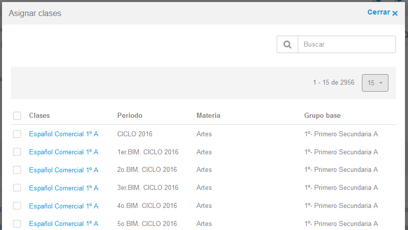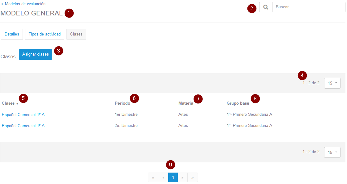 Se pueden seleccionar más de una clase/periodo/materia para añadir un modelo de evaluación. De igual forma se cuenta con un buscador de clases y la vista de 15, 25 y 50.