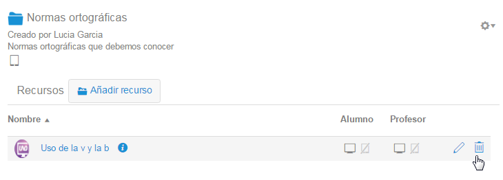 Usted también puede eliminar recursos de una colección, siempre que hayan sido añadidos por usted y no estén en uso. Para ello, acceda a la colección de la que desee borrar recursos y situese sobre el recurso a eliminar pulsando sobre el icono de la papelera: