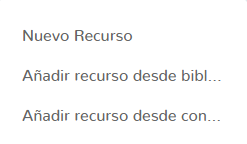 Desde estas opciones, podrá añadir recursos nuevos ("Nuevo Recurso") o ya existentes ("Añadir recurso desde la biblioteca, Añadir recurso desde contenido").