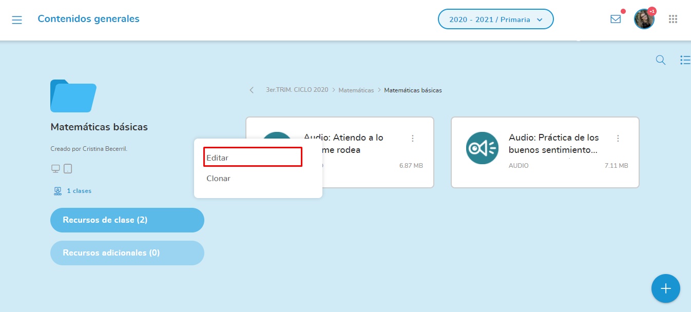 Al pulsar la carpeta de cualquier tema, se mostrarán los recursos del tema o proyecto.