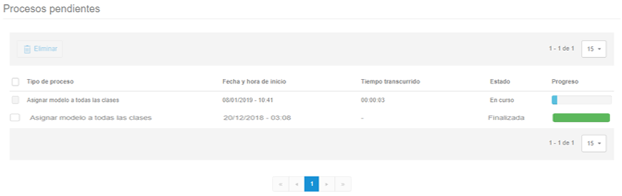 Se podrá visualizar el tipo de proceso, la fecha y hora de inicio, tiempo transcurrido, el estado y el progreso