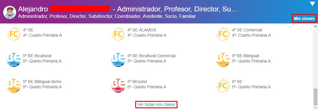 Lo encontramos en la franja donde muestra nuestro avatar, nombre y roles que tenemos, en la parte inferior derecha muestra Mis clases.