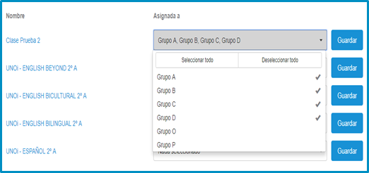 El administrador podrá seleccionar más de un grupo por clase y guardar los cambios