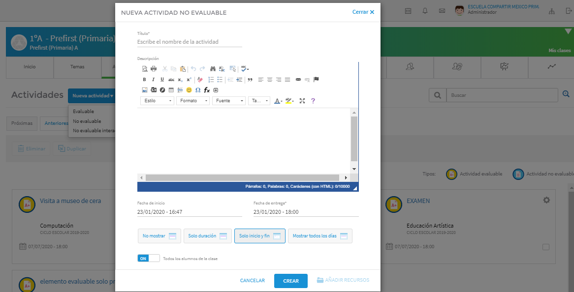 Se desplegara un menú donde indica que tipo de actividad deseas crear.