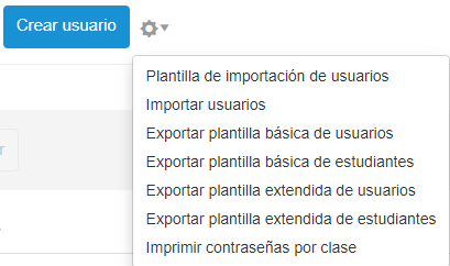 Usted podrá exportar los datos de los usuarios del LMS en un documento de Excel. Para ello, acceda al apartado "Usuarios" y pulse sobre el engrane y despliegue el menú. Podrá ver que se despliegan varias opciones.