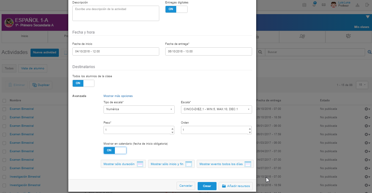También hay opciones avanzadas donde se puede escoger la escala, peso y orden de la actividad, así como la visibilidad dentro del calendario: