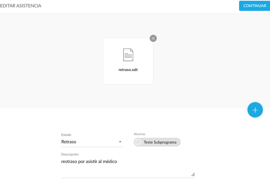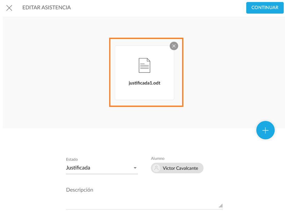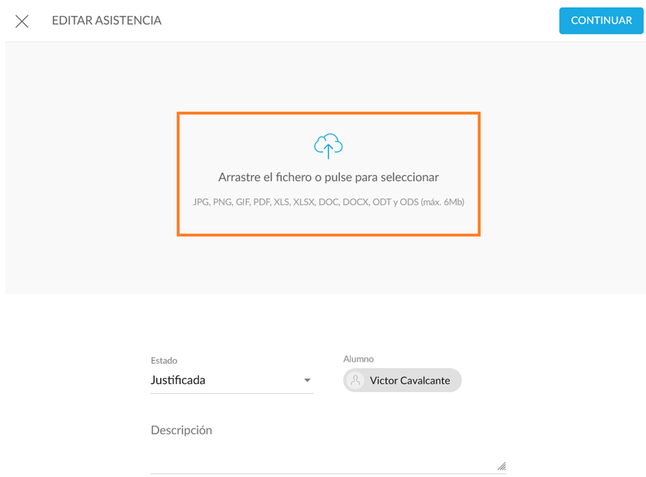 Cuando seleccionemos una falta justificable podremos poner una nota y/o adjuntar un fichero. La descripción no es obligatoria.