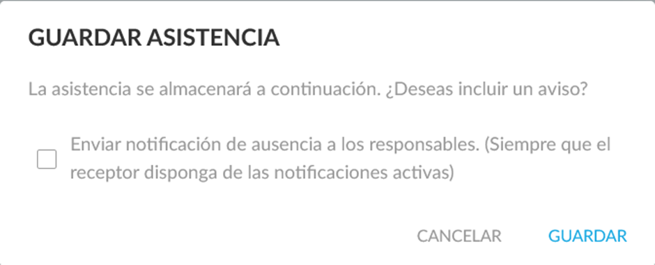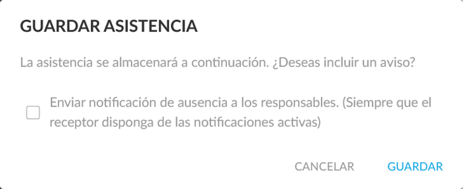 Cuando pulsamos “Guardar” y tenemos ausencias notificables marcadas nos pregunta si queremos avisar a los responsables: