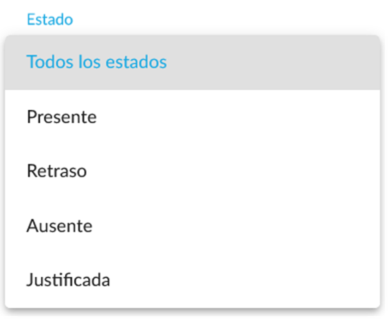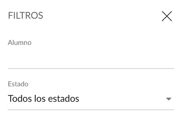 Se puede buscar por los filtros de Alumno y Estado, para llegar a la búsqueda se debe pulsar el botón de búsqueda y aparecerá el menú.