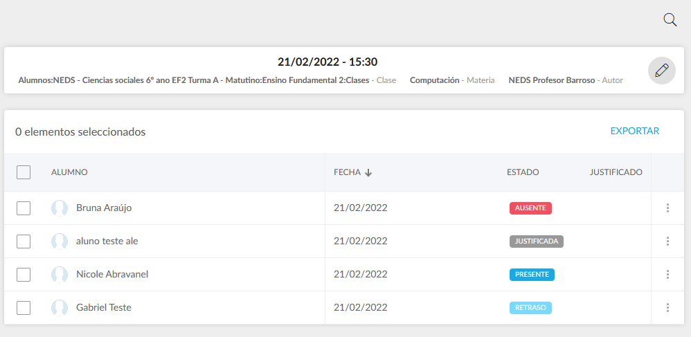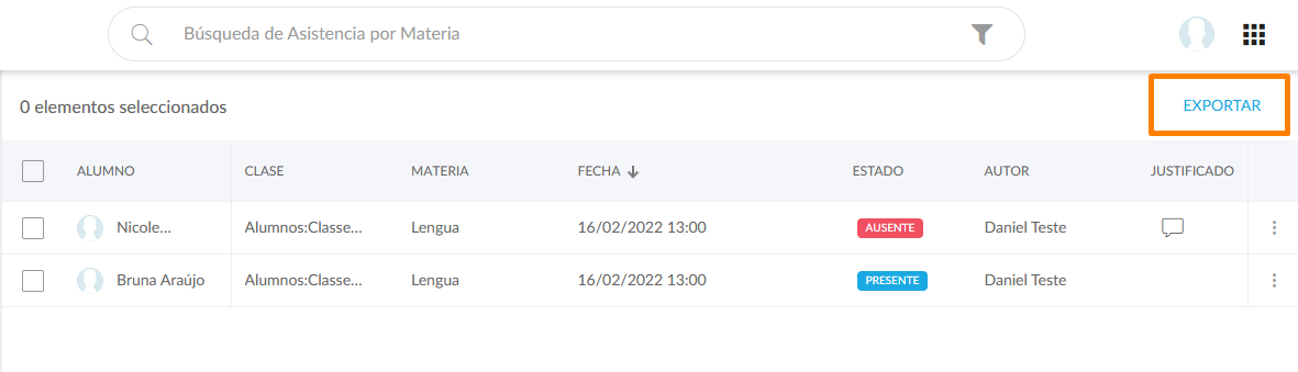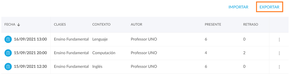 Desde aquí podrá exportar un csv con las asistencias pulsando en el botón “Exportar”