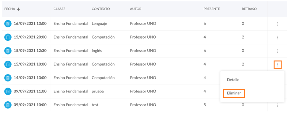 Si el usuario logueado es profesor o administrador al pulsar en el menú de asistencias verá el listado de todas las asistencias creadas.