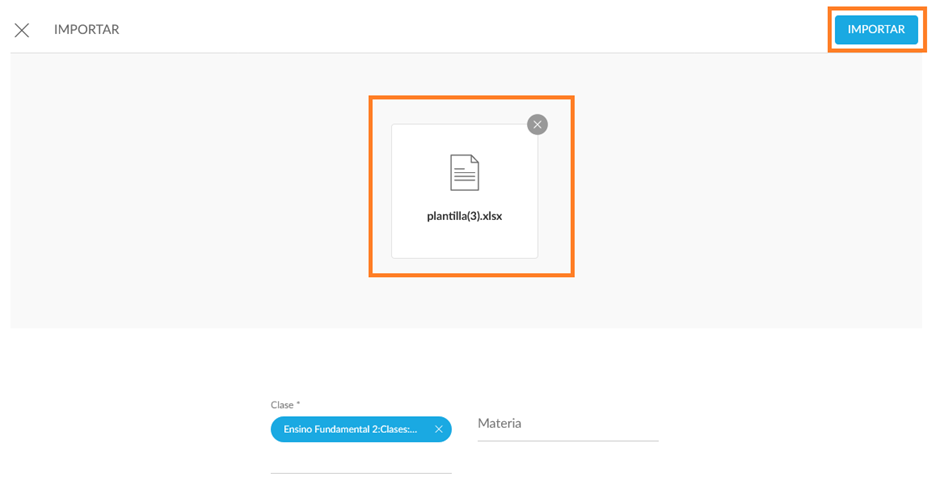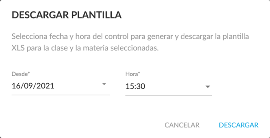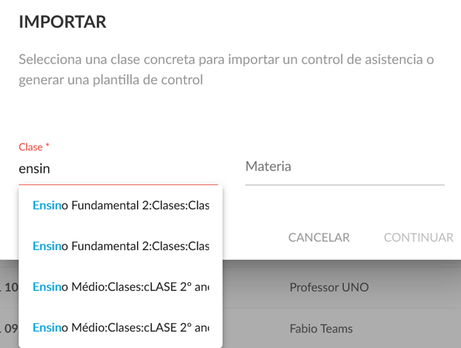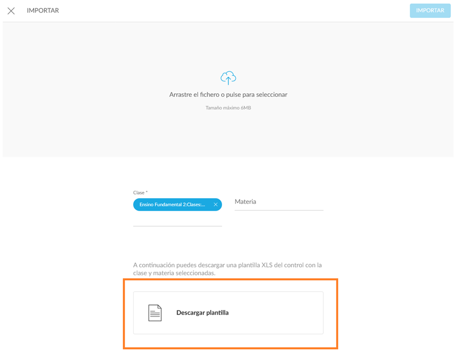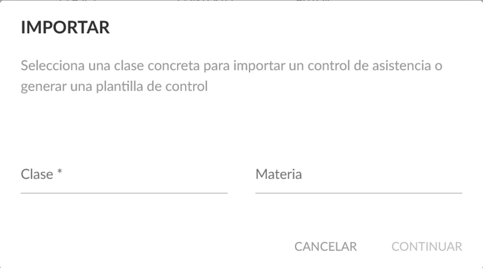 Una vez pulsado el botón de importar nos saldrá la siguiente pantalla en la que podremos introducir la clase y la materia para el que queremos importar el control: