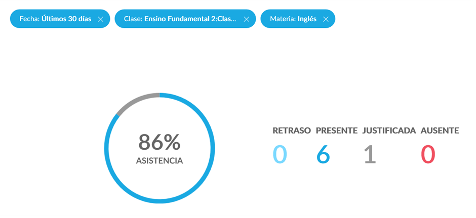 En función del rango de fechas seleccionado, se mostrará la información en el informe de una una forma u otra. Si el rango de fechas seleccionado es igual o inferior a 7 días, entonces se mostrará un gráfico de barras con una barra para cada día. En cada barra de la gráfica se mostrará el porcentaje de cada tipo de asistencia en los controles acorde a los filtros de búsqueda aplicados. En el caso de que sea superior a 7 días, se mostrará un resumen por tipo de presencia y un porcentaje total de "presente" frente a los demás valores.