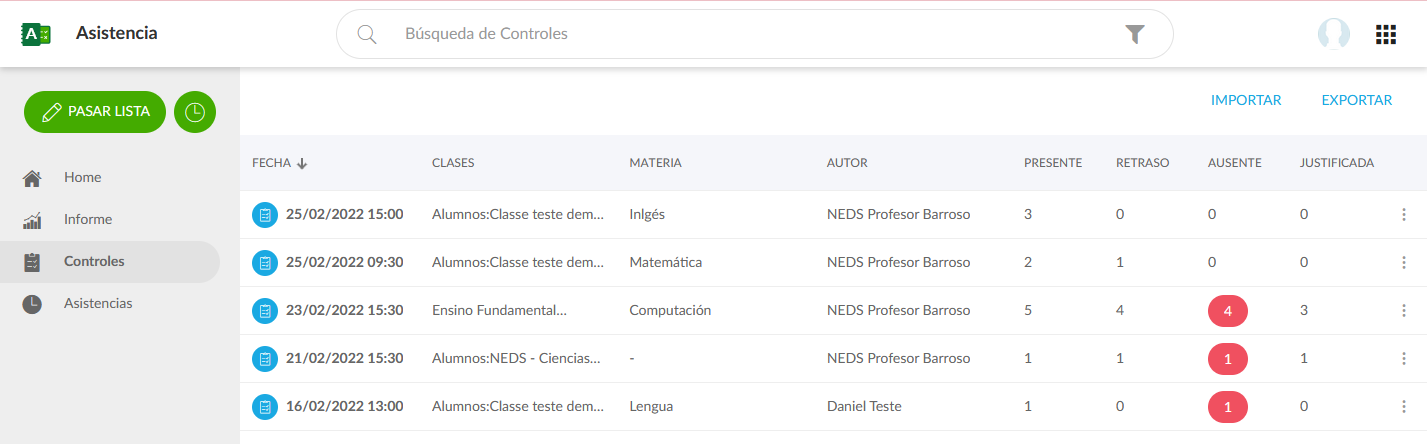 Cuando un profesor o administrador pasan lista, entonces se genera un control de asistencia. El profesor y administrador podrán consultar los controles sobre los que tienen visibilidad, editarlos, ver los detalles o eliminarlos.