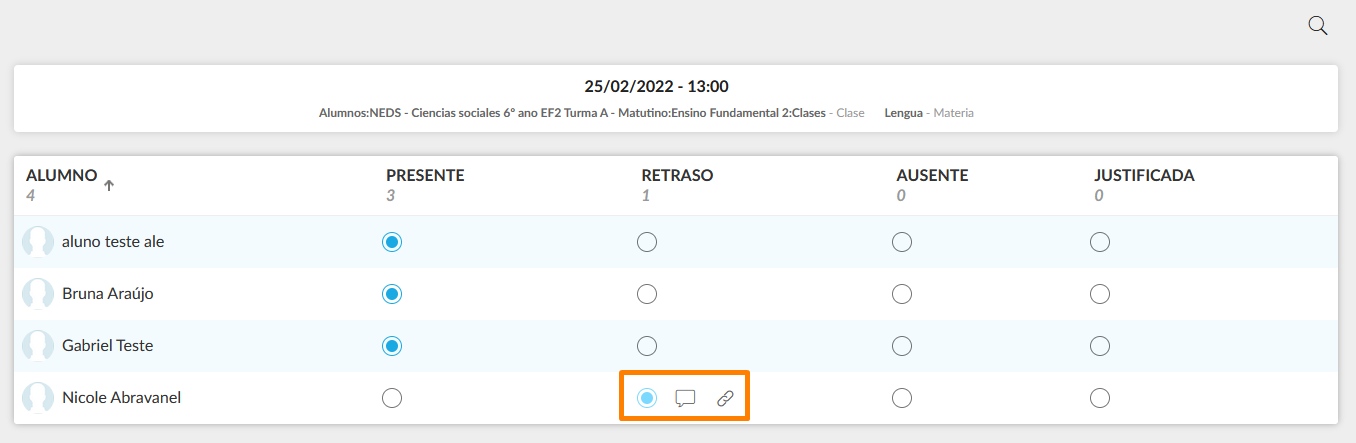 Un profesor o administrador podrá pasar lista sobre un conjunto de alumnos de una clase en un momento determinado y podrá indicar para cada alumno si estaba presente, se ha retrasado o se ha ausentado, así como el motivo de la ausencia o los documentos asociados a la misma.