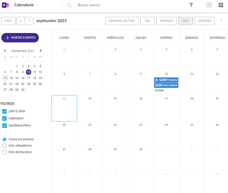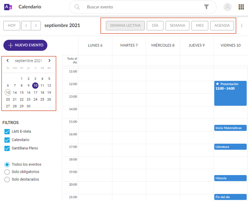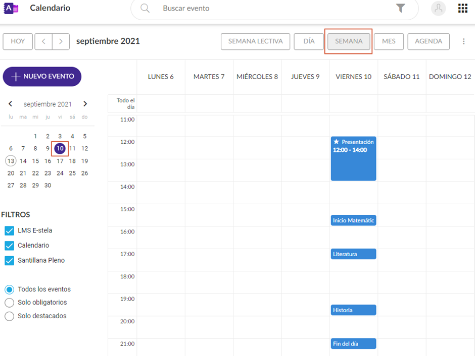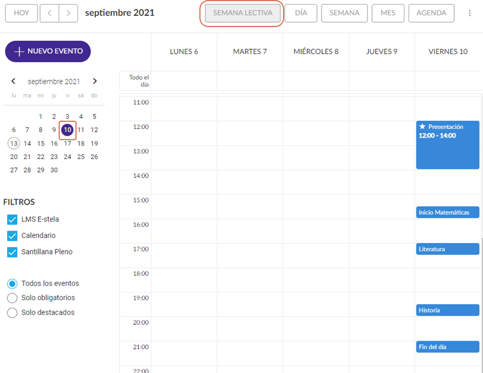 Semana Lectiva: Muestra los eventos de la semana del día escogido en el calendario sin tener en cuenta los días de fin de semana.