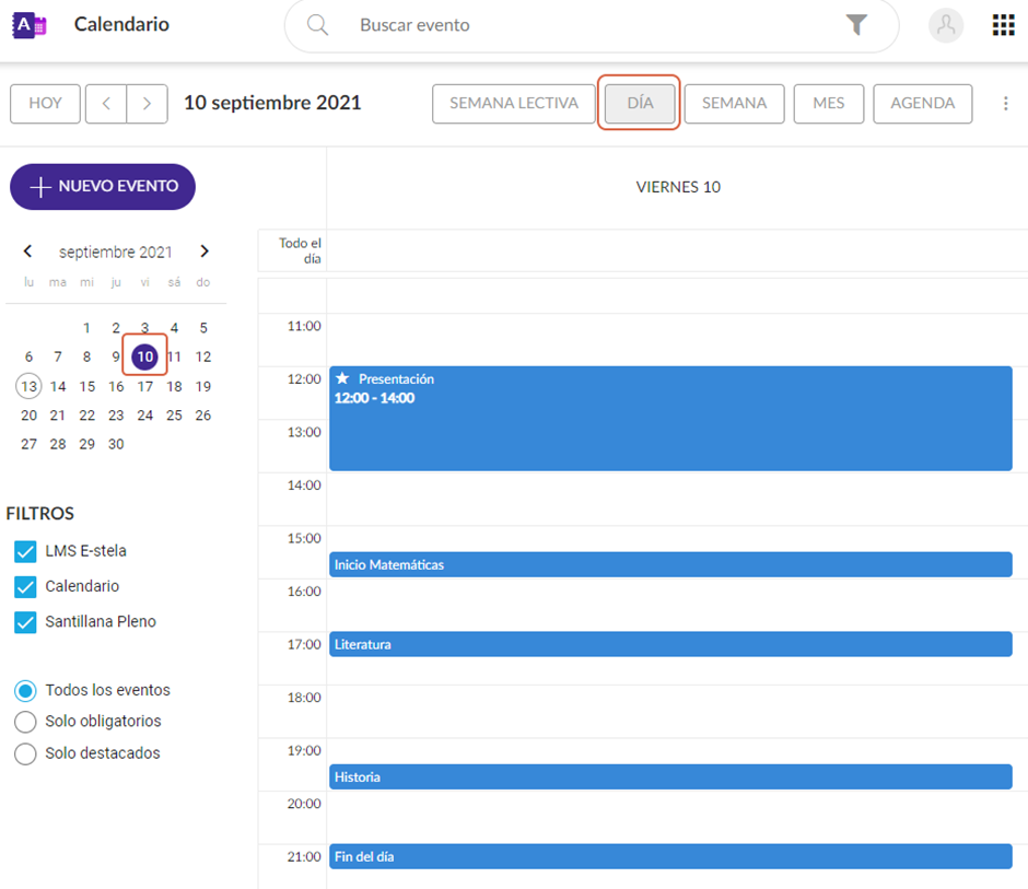Día: Muestra los eventos del día escogido en el calendario