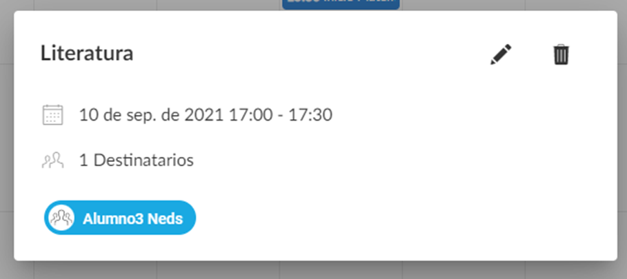 En cualquiera de las vistas al presionar sobre un evento se mostrará una pantalla con el título del evento, un icono de lápiz en caso de poder actualizarlo, un icono de papelera en caso de poder eliminarlo, la fecha de duración del evento y el número de destinatarios.