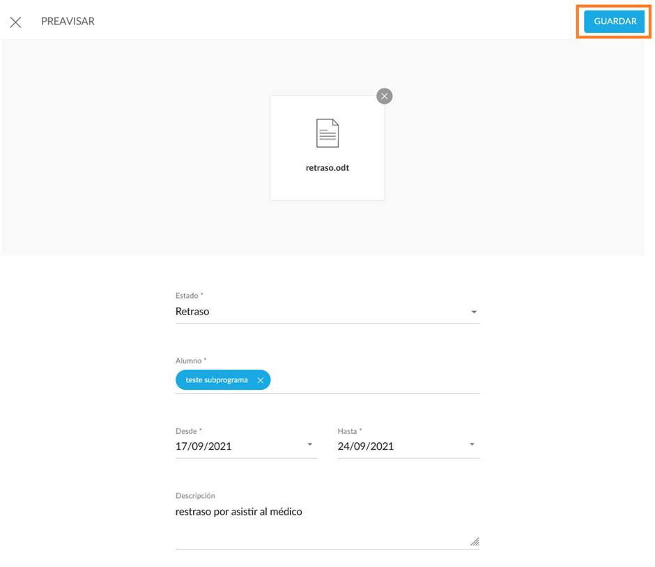 Los profesores y administradores podrán crear preavisos para los alumnos, con esto se podrá indicar en un rango de fechas o fecha en concreto la ausencia con justificación de uno o varios alumnos durante un periodo de tiempo.