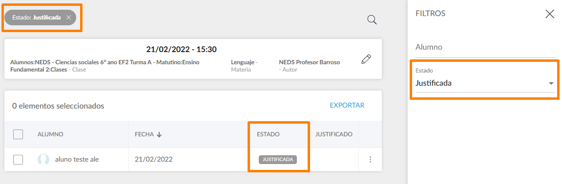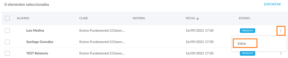 Desde aquí podrá exportar un csv con las asistencias pulsando en el botón “Exportar”