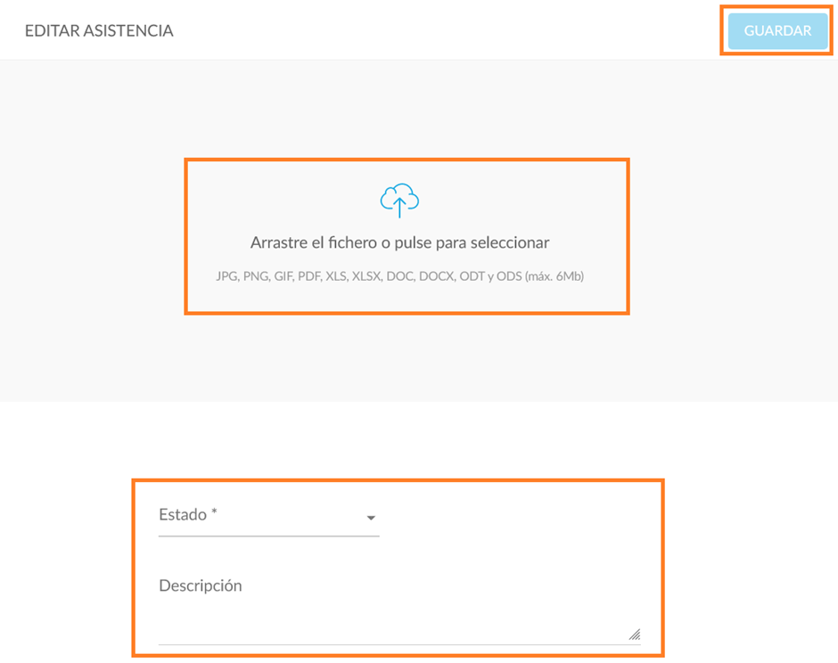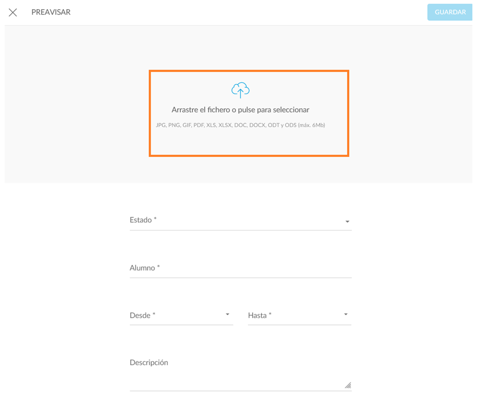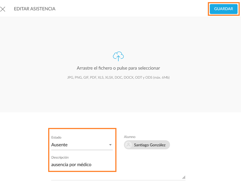 Cuando seleccionemos una falta justificable podremos poner una nota y/o adjuntar un fichero. La descripción no es obligatoria.