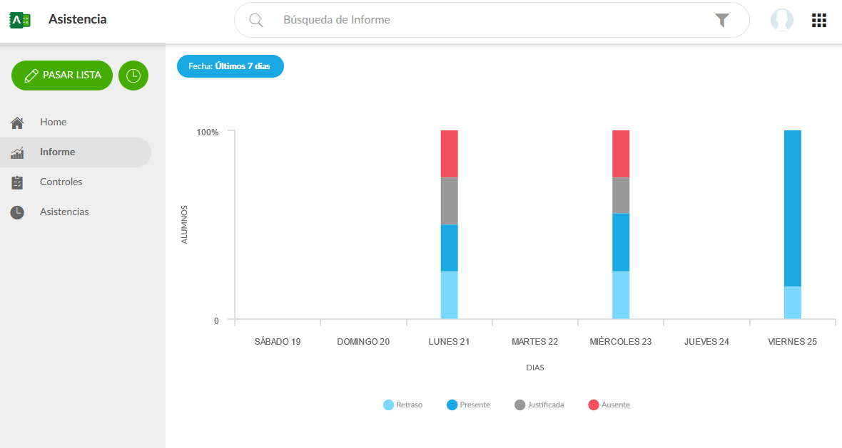 En función del rango de fechas seleccionado, se mostrará la información en el informe de una una forma u otra. Si el rango de fechas seleccionado es igual o inferior a 7 días, entonces se mostrará un gráfico de barras con una barra para cada día. En cada barra de la gráfica se mostrará el porcentaje de cada tipo de asistencia en los controles acorde a los filtros de búsqueda aplicados. En el caso de que sea superior a 7 días, se mostrará un resumen por tipo de presencia y un porcentaje total de "presente" frente a los demás valores.
