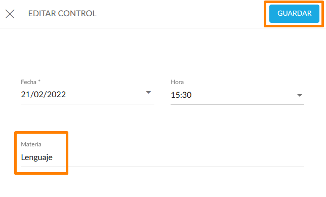 Los campos de fecha, hora y clase son obligatorios, pero el campo materia es opcional.