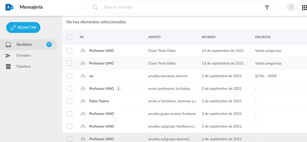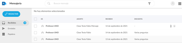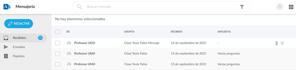 Cuando entramos a la parte de mensajería vemos por defecto la bandeja de recibidos con los mensajes que hayamos recibido viendo primero los últimos que hemos recibido. También se podrán diferenciar los mensajes leídos de los no leídos.