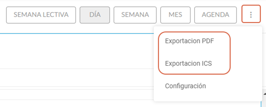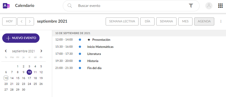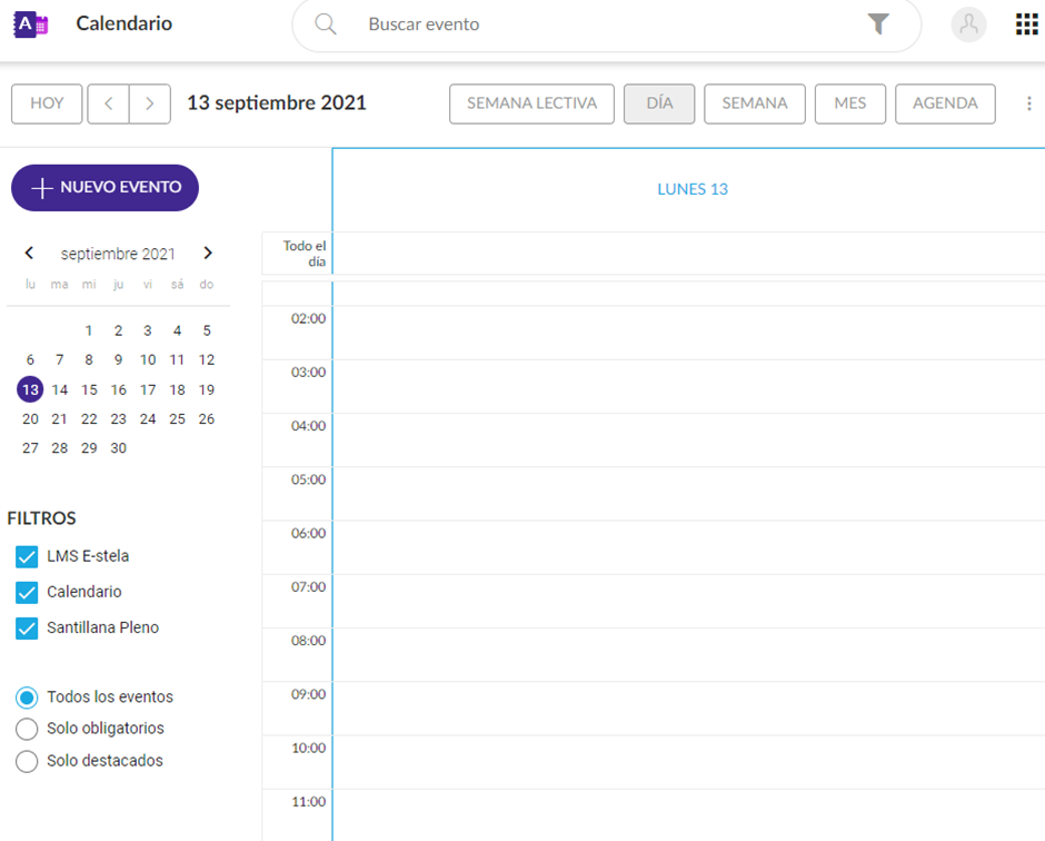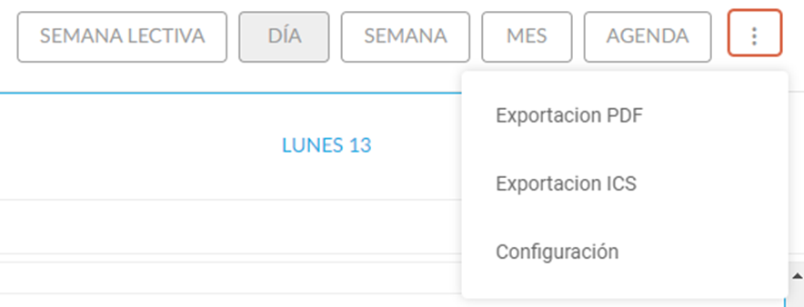 Existem as seguintes opções de exibição: semana letiva, dia, semana, mês ou agenda; que podem ser escolhidas no menu localizado no canto superior direito da tela. Os eventos que serão mostrados são calculados com base no dia selecionado no calendário no calendário exibido do lado esquerdo e na visualização selecionada.
