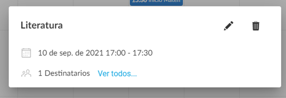Em qualquer uma das visualizações, ao clicar sobre um evento exibirá uma tela com o título do evento, um ícone de lápis (se puder ser atualizado), um ícone de lixeira (caso de poder ser excluído), a data de duração do evento e o número de destinatários.