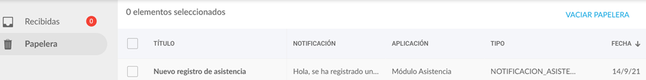 Se selecionarmos a lixeira vazia, todas as notificações nela serão excluídas permanentemente.
