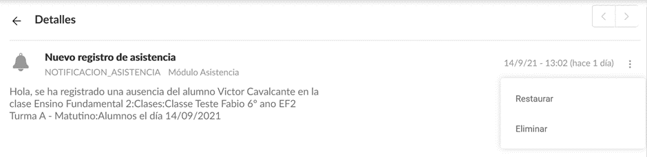 Si pulsamos sobre la notificación se puede ver el detalle. Desde el detalle podremos restaurar la petición o eliminarla