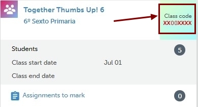 Un Class code (Código de clase) es un código con ocho letras y números (por ejemplo, AB1B02V3), que se refiere a una clase de alumnos en Richmond Learning Platform. Es un dato alfanumérico que comprende 8 espacios, lo proporciona el Maestro o la institución. Aparece en la página principal del usuario docente (Maestro) en la esquina superior derecha de cada recuadro de clase. Tu Profesor o un Training Manager en tu escuela o universidad te podrá dar un Class code para entrar a registrarte en la plataforma. Si entras, automáticamente se te añadirá a esa clase cuando completes el proceso de registro. Sin embargo, también es posible registrarse en Richmond Learning Platform sin introducir un Class code. Puedes añadirlo más tarde, o si no estás estudiando en una institución, puedes utilizar Richmond Learning Platform sin ser parte de una clase, de manera independiente (Autoestudio).