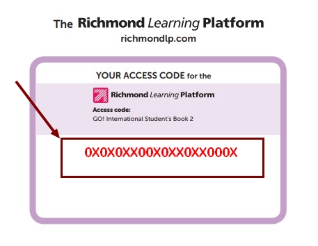 Un Access code (Código de acceso) es un código de letras y números (por ejemplo, RP4E5F678923), que se refiere a un producto de Richmond, como un libro de texto. Es un dato alfanumérico que puede ir desde 12 hasta 20 espacios (Por ejemplo: XX00-0X0X-00XX-0XX0) que aparecen en la página interna de la portada de tu libro, en una tarjeta u hoja añadida al libro, o entregado por tu institución; si se trata de un producto digital, puede llegarte por correo electrónico o en la compra del producto por eCommerce. Es necesario introducir un Access code cuando te registras a Richmond Learning Platform.